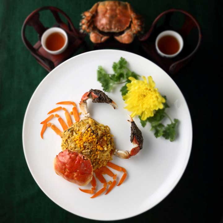 菊花对蟹形这是一道功夫极深的招牌菜。将蟹肉、蟹黄细细剥出后,再一一拼接还原蟹形,色、香、味、形俱佳。食客就可以不费力地完整享受蟹肉、蟹黄、蟹膏、蟹腿、蟹钳的美味。这道菜的精华在于味道鲜美、肉质细腻、营养丰富。富含:优质蛋白、优质脂肪、钙、磷、铁、核黄素、10 余种游离氨基酸等。品时再配以特调的精制调料,使蟹的鲜美发挥到了极致,真是美不胜收。 |
